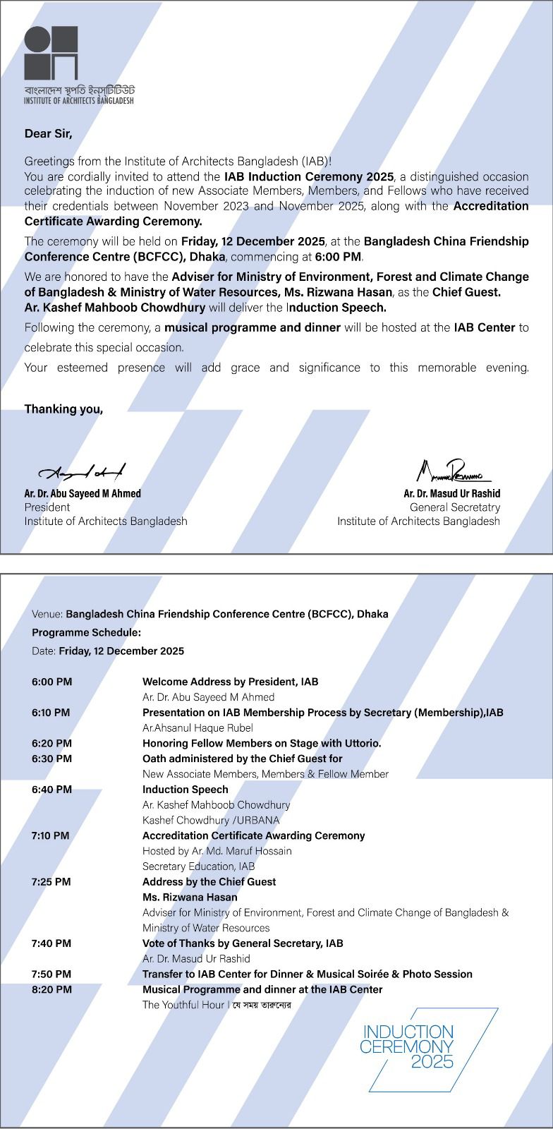 The accreditation was awarded on 12 December 2025 during the Arch Summit 2025. The certificate was formally received by Maj Gen Md Nasim Parvez, BSP, ndc, afwc, psc, Commandant of MIST, from Ar. Dr. Abu Sayeed M. Ahmed, President of the Institute of Architects Bangladesh.