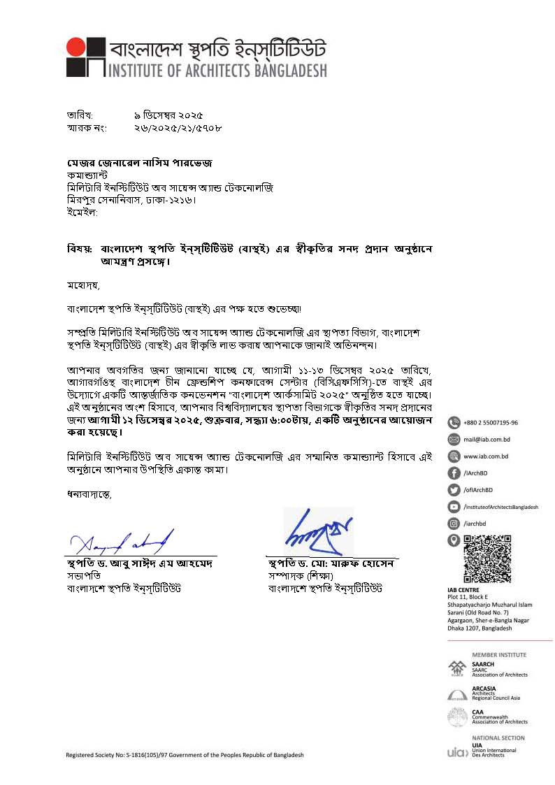The Military Institute of Science and Technology (MIST) has achieved a significant milestone as its Bachelor of Architecture (B.Arch) program received official accreditation from the Institute of Architects Bangladesh (IAB) for the period January 2025 to January 2030.